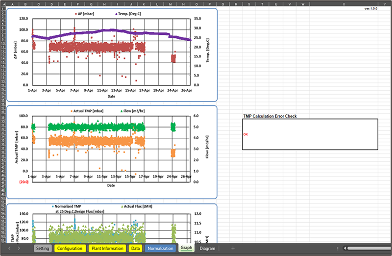 The Toray MBR Normalization Sheet is developed to normalize the operating data of Toray MBR modules. It includes temperature compensation, permeability calculation, and unit conversion. Based on these calculations, the sheet generates graphs showing temperature, filtration flow rate, filtration flux, permeability, and normalized TMP. By using this sheet, users can accurately evaluate the operating conditions of Toray MBR modules.